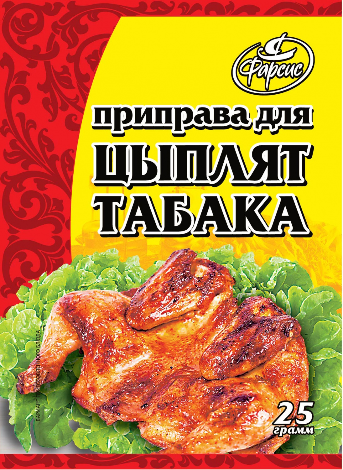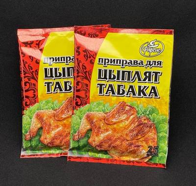 Состав приправы для цыпленка табака: лук, базилик, кориандр, хмели-сунели, петрушка, перец черный, перец красный, паприка, кориандр, чеснок, соль.